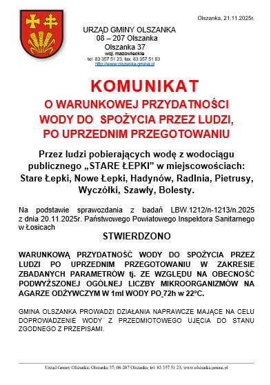 21 - 11 - 2025 KOMUNIKAT O WARUNKOWEJ PRZYDATNOŚCI WODY DO SPOŻYCIA PRZEZ LUDZI, PO UPRZEDNIM PRZEGOTOWANIU