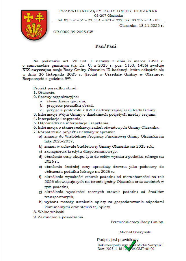Zawiadomienie o sesji zwyczajnej Rady Gminy Olszanka